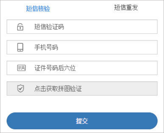 3.依次填寫驗(yàn)證信息(驗(yàn)證碼、手機(jī)號(hào)碼、證件號(hào)碼后六位)并完成圖形驗(yàn)證,單擊【提交】按鈕。