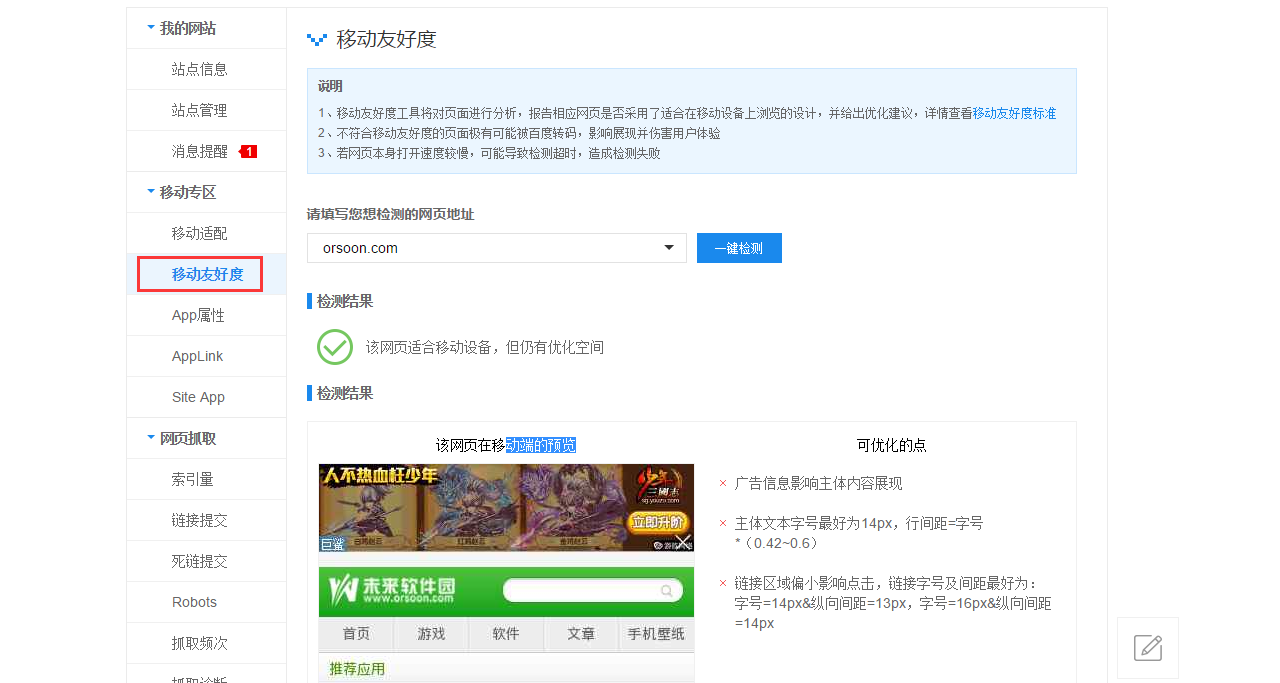 如果上面幾點(diǎn)站長對于自己網(wǎng)站調(diào)整還無從下手的話,可以通過站長工具里面的移動友好度進(jìn)行評測,根據(jù)評測結(jié)果進(jìn)行網(wǎng)站調(diào)整。