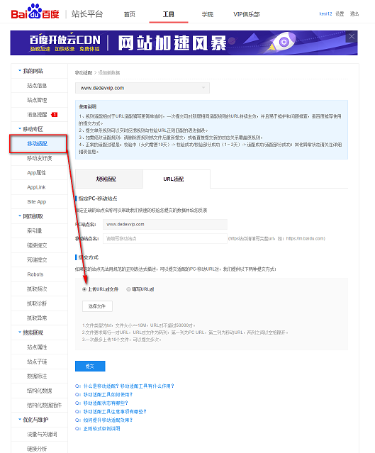 這一點(diǎn)我認(rèn)為尤其重要,因?yàn)樵谠缙诤芏嗑W(wǎng)站沒有移動化站點(diǎn),也并沒有做自適應(yīng)的處理,這樣就導(dǎo)致m.baidu.com在收錄時,是被百度收錄了的PC頁面或者被百度轉(zhuǎn)碼,所以我們在做了移動站點(diǎn)后第一件要做的事情就是做好適配,這里站長學(xué)院介紹了三種適配的方式(參考鏈接:http://zhanzhang.baidu.com/college/courseinfo?id=156),在做完網(wǎng)站的適配之后,站長也可以將pc站和移動站一一對應(yīng)的關(guān)系在百度站長平臺后臺進(jìn)行提交。