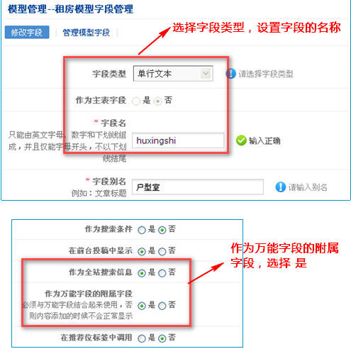 接下來添加萬能字段 tenement 的附屬字段,并在字段設置中,選擇為萬能字段附屬字段,以戶型室huxingshi為例,其它附屬字段同樣的操作,如下圖所示: