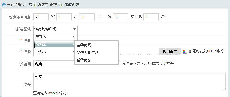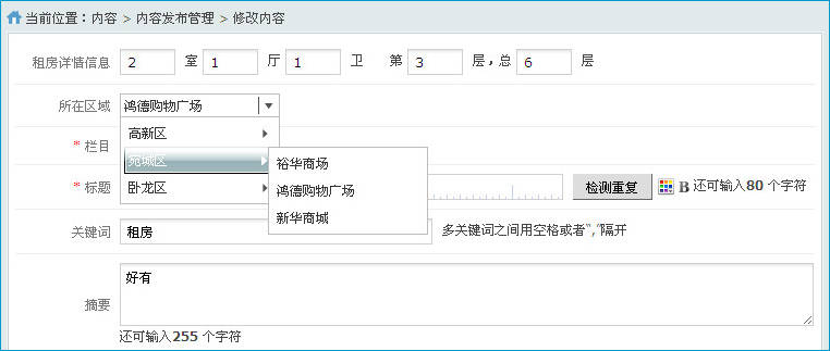 添加完成以后,在模型應用欄目,添加信息時,就會出現聯動菜單選擇框,效果如下圖所示: