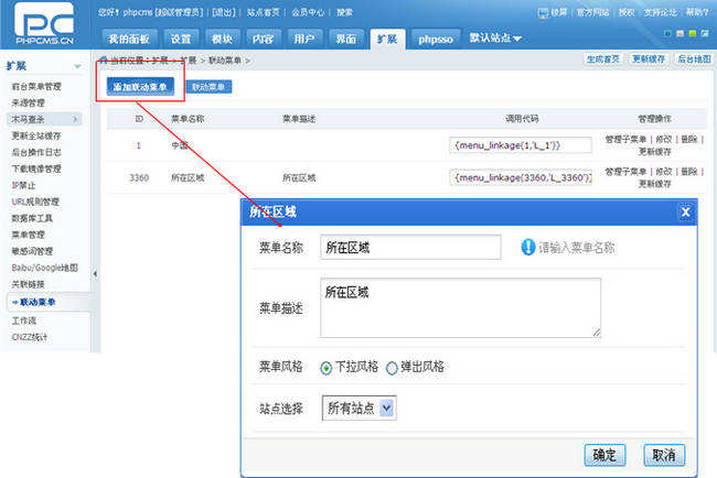 下面我們以為租房模型添加一個所在區(qū)域聯動菜單為例,說明聯動字段的使用, 首先添加聯動菜單數據,并選擇菜單風格和應用站點范圍(V9 支持多站點站群系統),如下圖所示:
