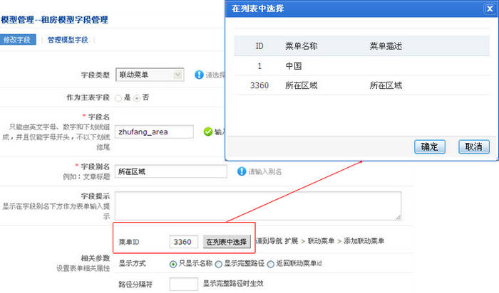 添加完聯動菜單數據以后,接下來進行聯動菜單字段的添加,字段類型選擇聯動菜單,然后在相關參數設置選項,選擇剛才添加的聯動菜單項,如下圖所示: