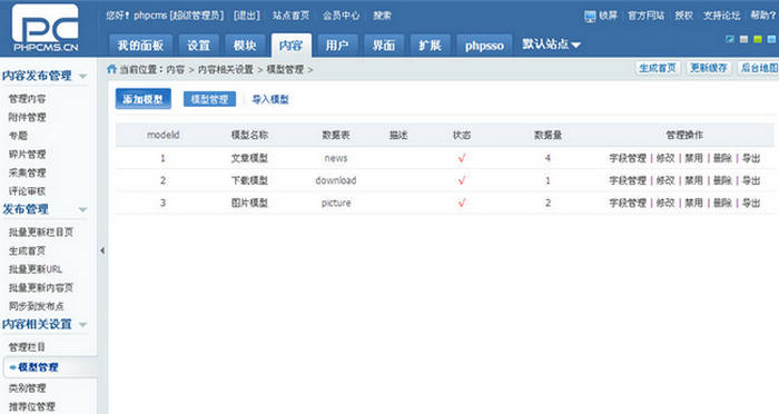PHPCMS 允許使用者根據自身需求自定義模型,來構建多樣性網站。