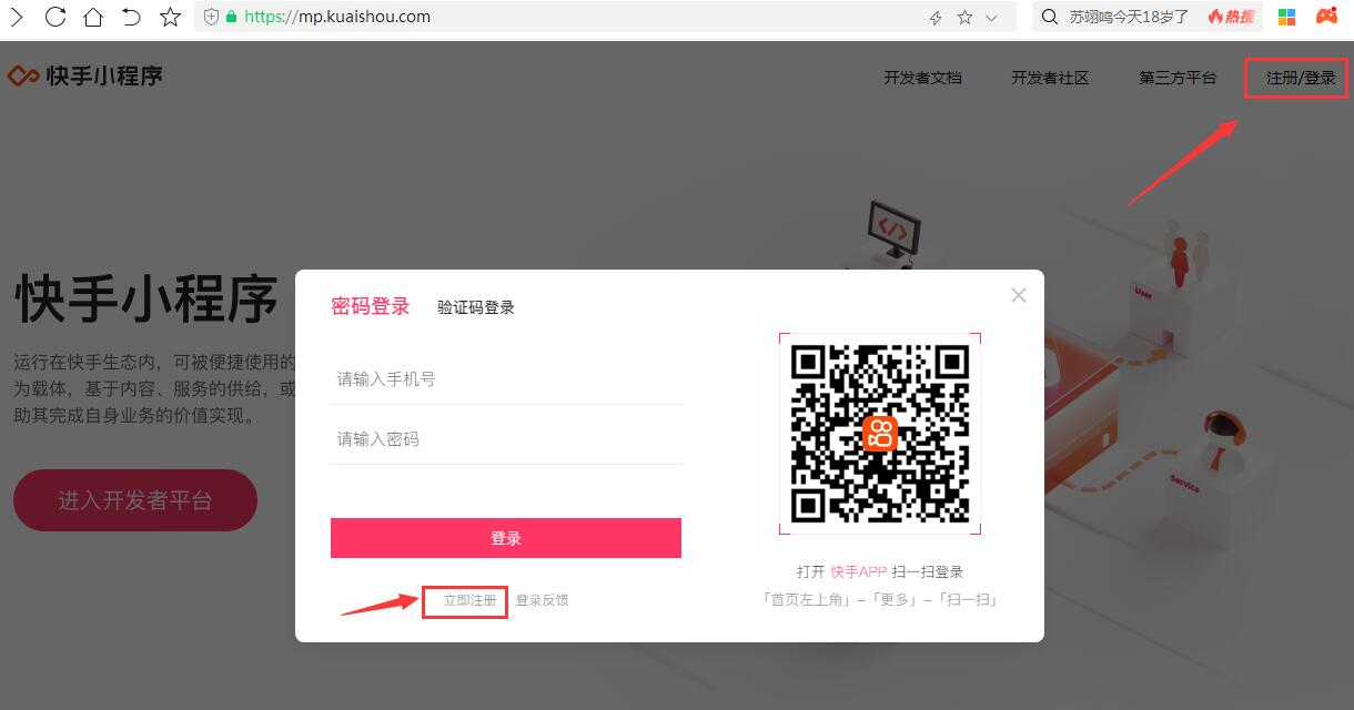 (1)登錄快手小程序官網(wǎng) https://mp.kuaishou.com/ 點(diǎn)擊右上角“注冊(cè)/登錄”,“立即注冊(cè)”,進(jìn)行帳號(hào)注冊(cè)。