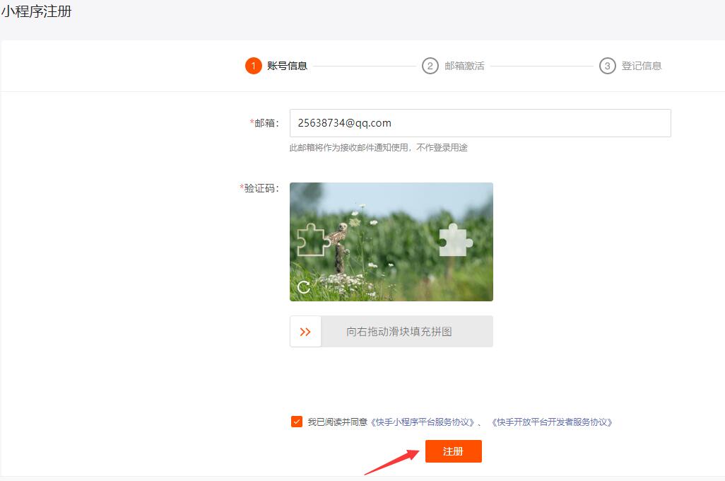 進(jìn)入“小程序注冊(cè)”界面,填寫帳號(hào)信息:郵箱、驗(yàn)證碼,勾選服務(wù)協(xié)議,然后點(diǎn)注冊(cè)。