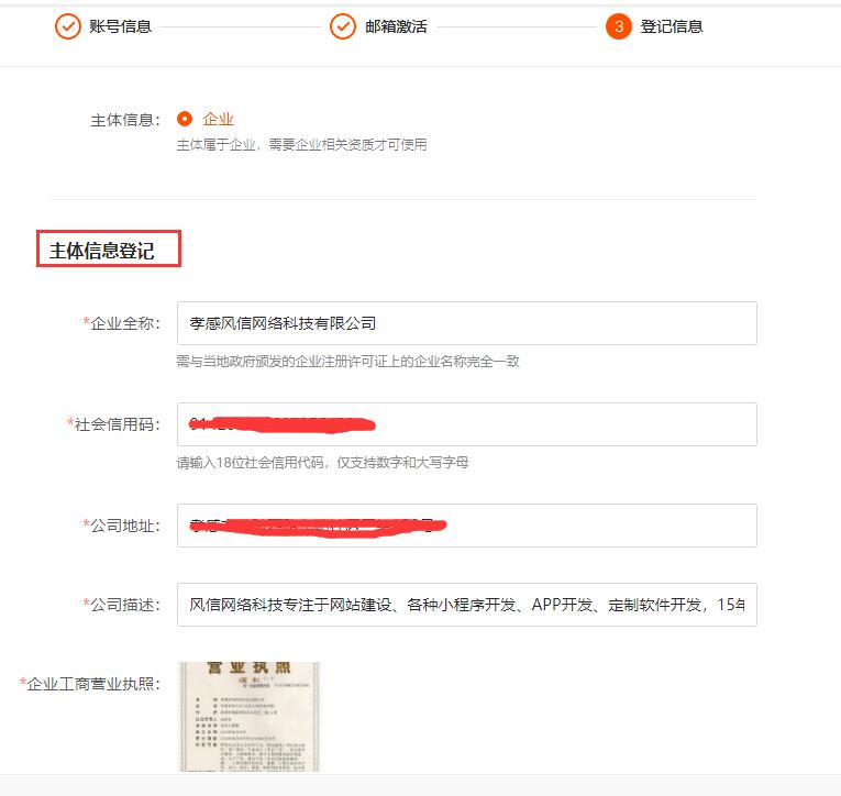 填寫“主體信息登記”,企業(yè)全稱,社會(huì)信用碼,公司地址,公司描述,上傳工商營(yíng)業(yè)執(zhí)照
