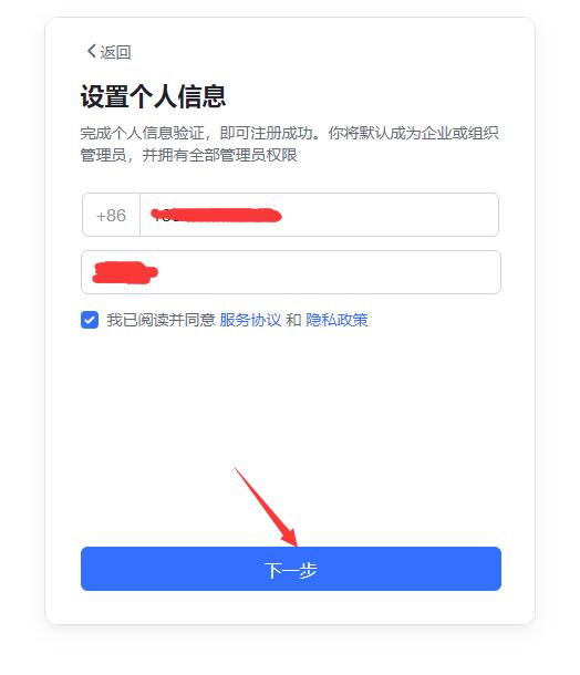 自動(dòng)進(jìn)入“設(shè)置個(gè)人信息”界面,填寫手機(jī)號(hào)、姓名,勾選服務(wù)協(xié)議,點(diǎn)下一步。