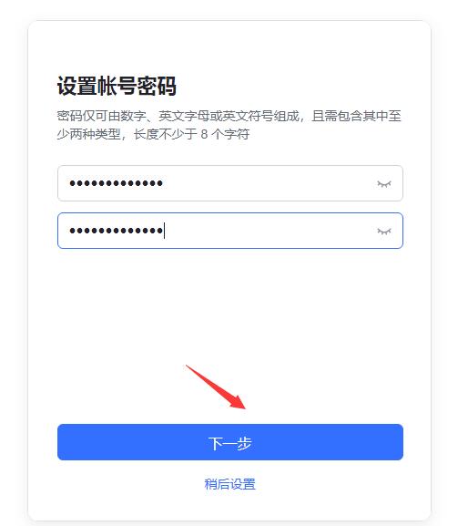 輸入手機(jī)驗(yàn)證碼后,自動(dòng)進(jìn)入“設(shè)置帳號(hào)密碼”界面,設(shè)置密碼,然后點(diǎn)下一步。
